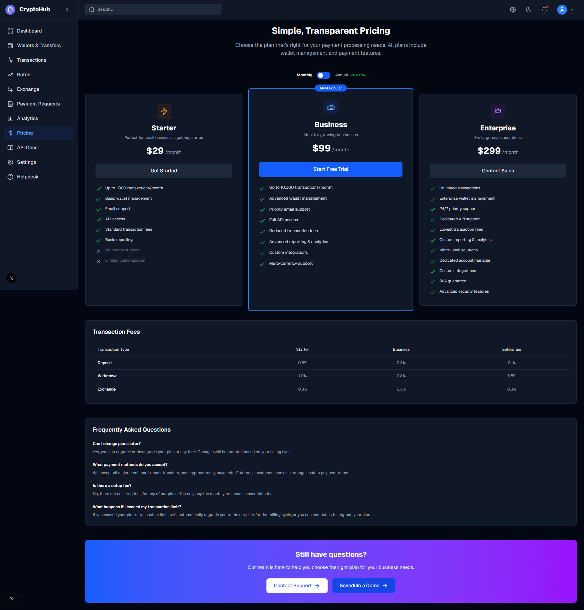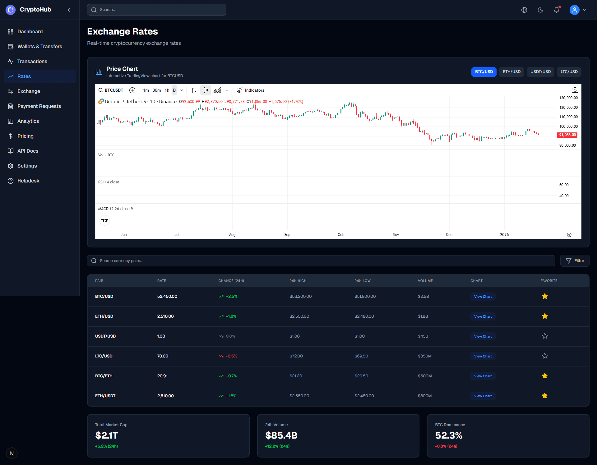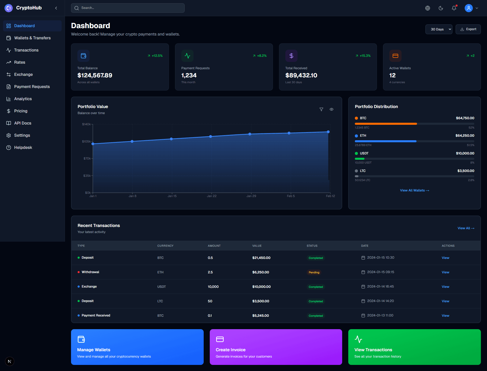 CryptoHub is a cryptocurrency payment platform that enables businesses to accept and manage crypto payments. It provides multi-wallet support (BTC, ETH, USDT, LTC), payment request generation, transaction tracking, exchange services, analytics dashboards, API integration for developers, and secure wallet management. The platform offers real-time portfolio monitoring, invoicing, and comprehensive transaction history to streamline crypto operations.